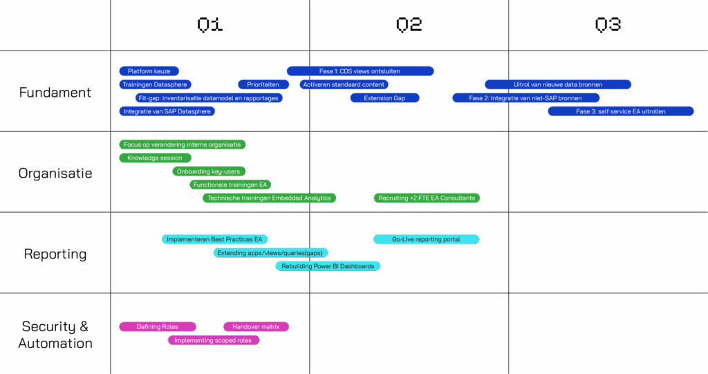 Een helder stappenplan waar je meteen mee aan de slag kan en dat richting geeft aan keuzes en volgorde, inclusief quick wins vs. strategische bouwblokken.